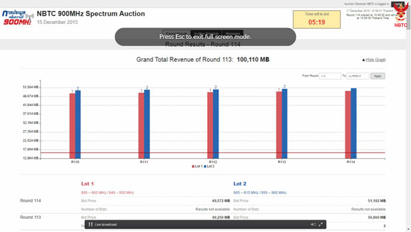 ตอนนี้ประมูลมาถึงรอบที่ 113 แล้ว โดยยอดยอมอยู่ที่ 100,110 ล้านบาท โดยแบ่งออกเป็น