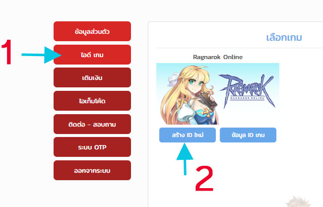 - เมื่อเข้าสู่ระบบมาแล้วให้เลือกเมนู “ไอดี เกม” แล้วกดสร้าง ID ใหม่ ที่เกม Ragnarok Online ดังภาพด้านล่าง