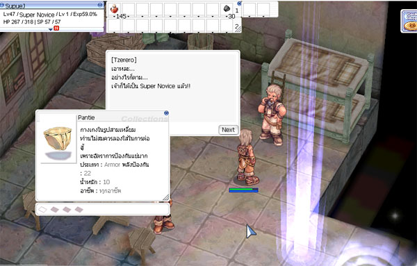 สิ่งที่คุณจะได้ไปเลยฟรีๆสำหรับการเปลี่ยน Super Novice นั้นก็คือ Pantie[1] หรือกางเกงในรู นั้นเอง ซึ่งก็ถือว่ามีราคาเอาเรื่องเหมือนกัน