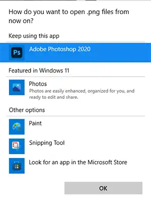 การทำลักษณะนี้จำเป็นต้องทำในทุกสกุลไฟล์ที่เราต้องการ หากต้องการเปลี่ยนรูปแบบการเปิดเป็นค่าเริ่มต้นเช่นไฟล์ .bmp, .jpg, .gif และอื่นๆ