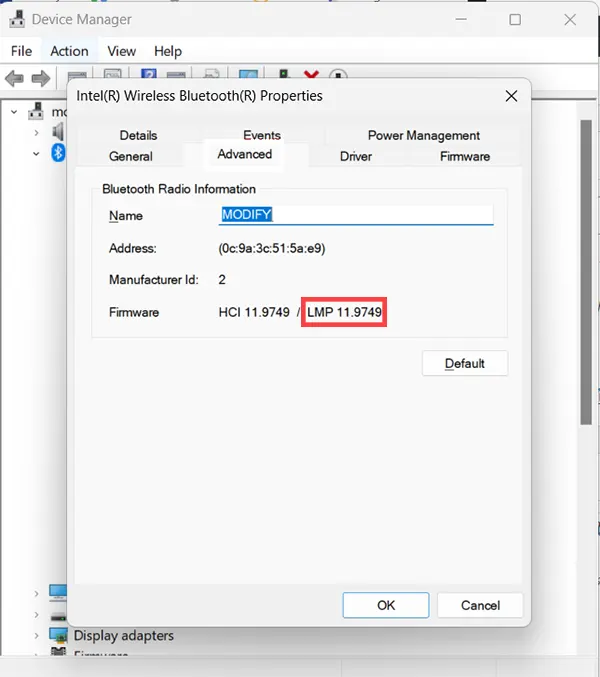 หากเลือก Properties ถูกตัวจะมีแถบ advanced ขึ้นมาดังภาพด้านบน ให้เลือกแถบดังกล่าวและดู Firmare ตรง LMP เวอร์ชัน จะบอกคร่าวๆได้ว่าคุณใช้ Bluetooth เวอร์ชันไหนอยู่ ต่างรางบอกเวอร์ชันดังต่อไปนี้